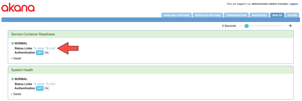 - Via the Akana Administration Console, Health tab. See System Health Tool user interface.